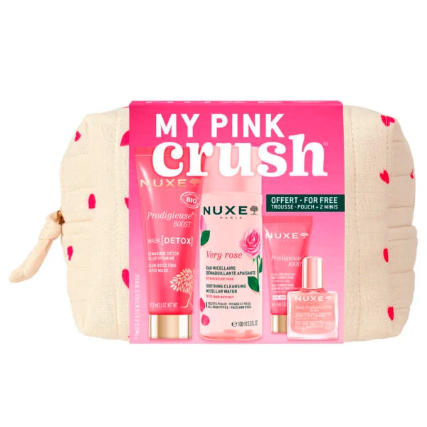 El cofre My Pink Crush es ideal, es ideal; incluye un neceser de corazones y una rutina completa de limpieza, tratamiento y luminosidad en tamaño viaje. ¡Un acierto seguro!