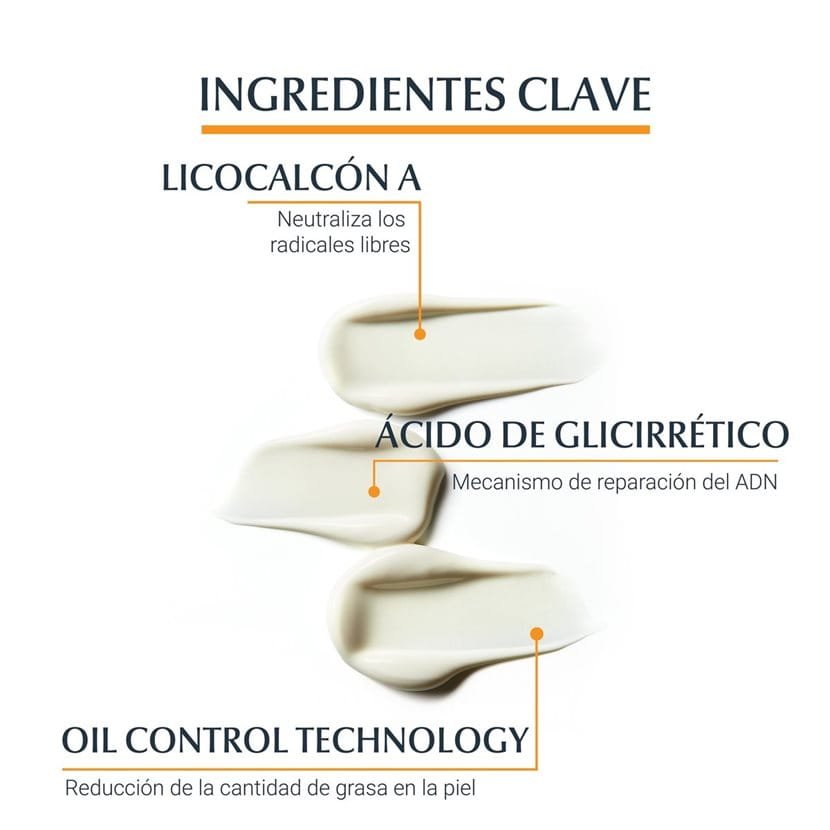 Su fórmula avanzada incluye filtros UV estables, que protegen frente a rayos UVA, UVB y luz azul (HEVL), además de estimular los mecanismos naturales de reparación del ADN de la piel. Incorpora almidón de tapioca para absorber el sebo y mejorar el acabado seco, sin dejar residuos grasos.