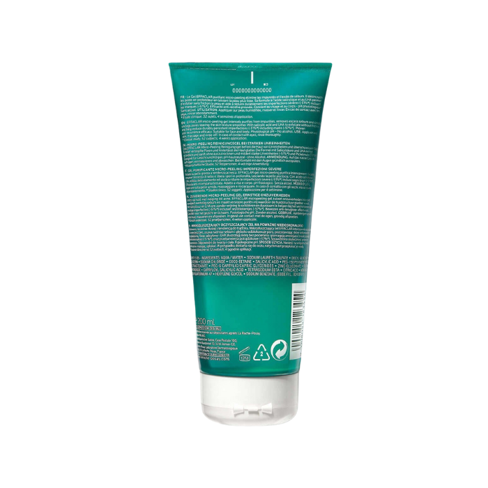 La Roche-Posay Effaclar gel purificante micro-exfoliante 200 mL se aplica una cantidad media (como el tamaño de una avellana).Lo ideal para garantizar una buena limpieza sería aplicarlo mañana y noche. Lo ideal es utilizar agua tibia ya que ayuda a desobstruir los poros. Masajeamos el rostro suavemente y con movimientos circulares. También podría utilizarse en el curpo si es necesario.