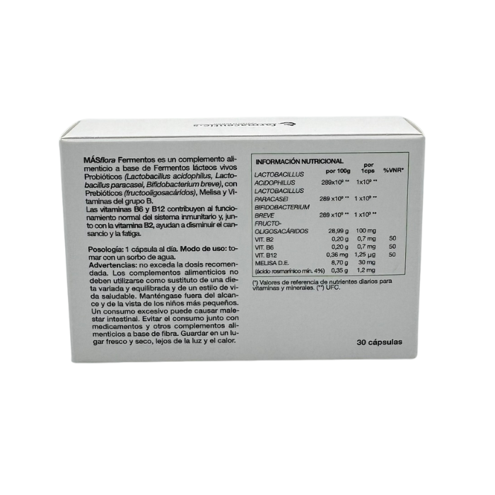 Más Flora Fermentos contiene 30 cápsulas indicadas para adultos. Sin gluten. Sin Lactosa.