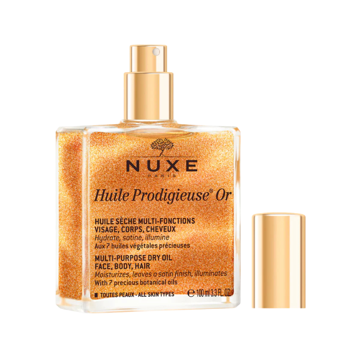 Nuxe Aceite seco Huile Prodigieuse Or 100 mL, el icónico aceite seco que combina un cóctel de 7 aceites preciosos 100 % vegetales con reflejos de nácares dorados de origen natural. Esta fórmula versátil aporta a rostro, cuerpo y cabello una luminosidad dorada-rosada iridiscente, realzando todos los tipos y tonos de piel con un efecto radiante y sofisticado.