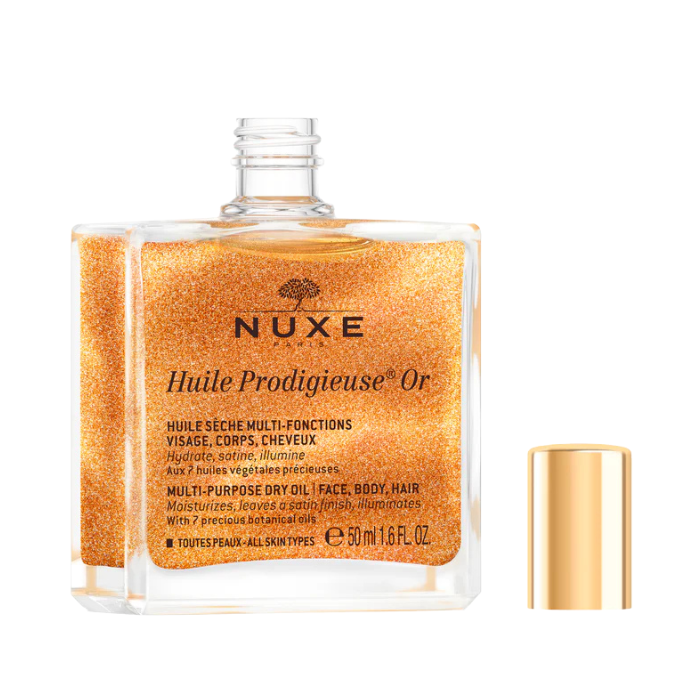 Nuxe Aceite seco Huile Prodigieuse Or 50 mL, el icónico aceite seco que combina un cóctel de 7 aceites preciosos 100 % vegetales con reflejos de nácares dorados de origen natural. Esta fórmula versátil aporta a rostro, cuerpo y cabello una luminosidad dorada-rosada iridiscente, realzando todos los tipos y tonos de piel con un efecto radiante y sofisticado.