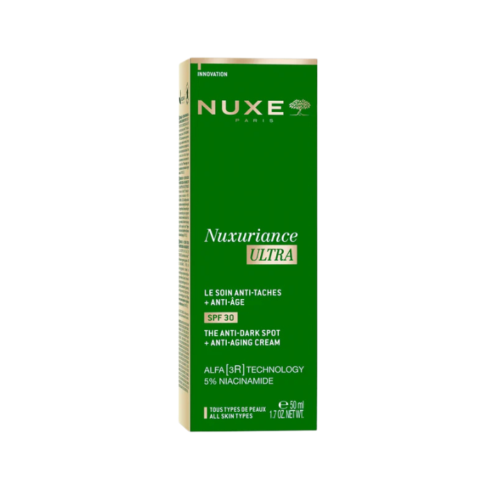 La Nuxe Nuxuriance Ultra Crema Antimanchas y Antiedad es una crema facial de tratamiento diario que combina acción antiedad global con corrección de manchas pigmentarias e integrada protección solar SPF30, diseñada para proteger la piel frente al fotoenvejecimiento prematuro mientras actúa sobre los signos del envejecimiento cutáneo. Esta fórmula de tratamiento “2 en 1” se inspira en la tecnología avanzada de la gama Nuxuriance Ultra de NUXE, que integra una mezcla patentada de activos antiedad más eficaces que el retinol para ayudar a revitalizar, regenerar y renovar la piel.