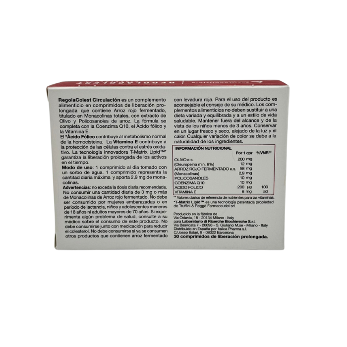 RegolaColest es un complemento alimenticio en comprimidos de liberación prolongada a base de Arroz rojo fermentado, titulado en Monocolinas totales, con extracto de Olivo y Policosanoles. La fórmula se complementa con la Coenzima Q10, el Ácido Fólico y la Vitamina E.