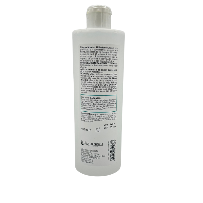 Solución Micelar Farmacia Yébenes 127 es un Agua Micelar Hidratante 2 en 1 que limpia eficaz y suavemente los ojos y el rostro, respetando la barrera hidrolipídica de la piel. Contiene ácido hialurónico de origen biotecnológico con un alto grado de pureza y actividad hidratante. Sin perfume. No comedogénico.