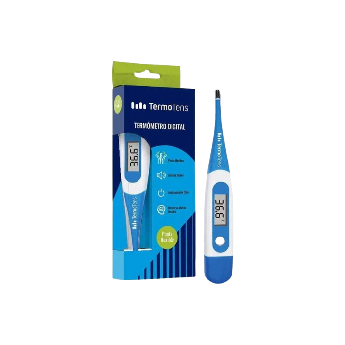 Termómetro Digital Termotens es la solución práctica para el control de la temperatura corporal. Su principal ventaja competitiva es su punta flexible, que permite adaptarse a las formas del cuerpo (axilar, oral o rectal) sin causar molestias ni riesgos de rotura, lo que lo convierte en el modelo favorito de los padres para el cuidado de bebés y niños pequeños.